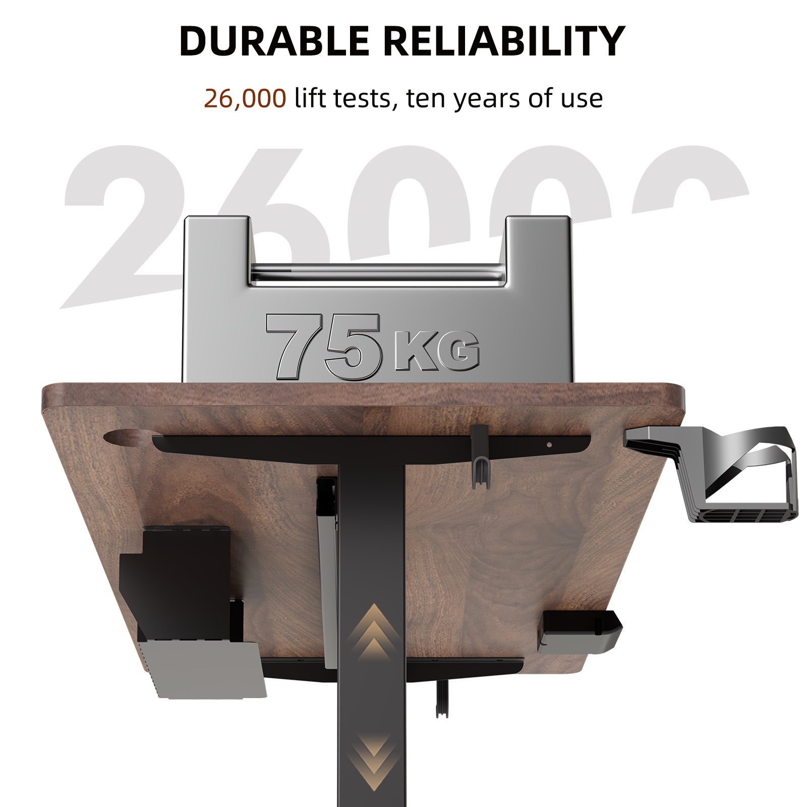 The industrial-grade steel frame combined with a durable desktop supports up to 75 kg. Tested more than 26,000 times for stability and durability, the motor ensures long-lasting use. A built-in cable management box keeps your workspace organized and clutter-free.