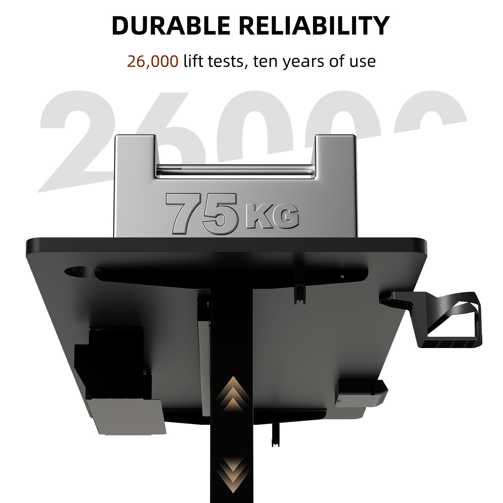 The industrial-grade steel frame combined with a durable desktop supports up to 75 kg. Tested over 26,000 times for stability and durability, the motor ensures long-lasting use. A built-in cable management box keeps your workspace neat and organized.