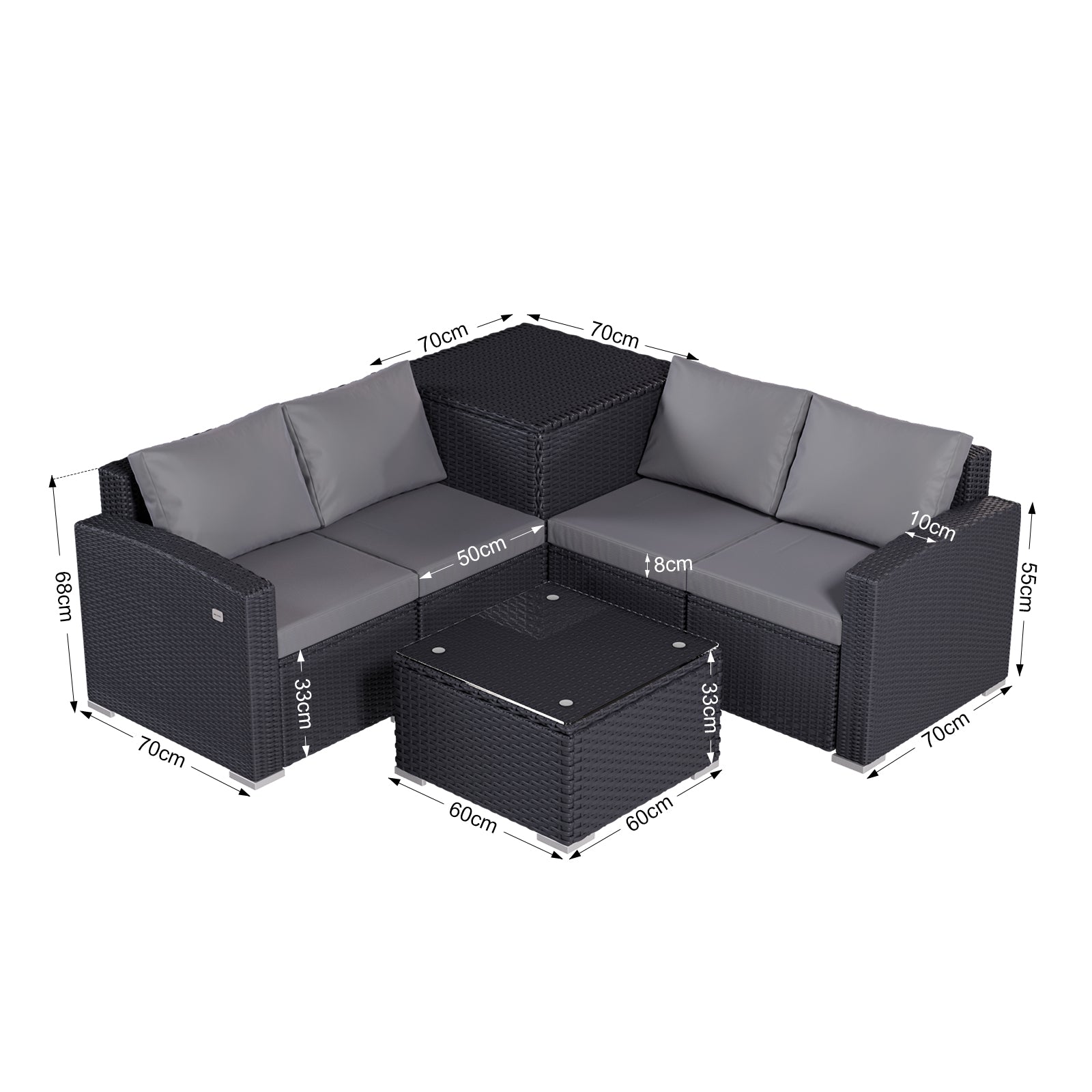 The 0.5cm thick tempered glass tabletop is highly impact-resistant. The 60×60×33cm moisture-resistant storage box offers ample space. The sofas use powder-coated steel frames for excellent load-bearing capacity and long-lasting durability.