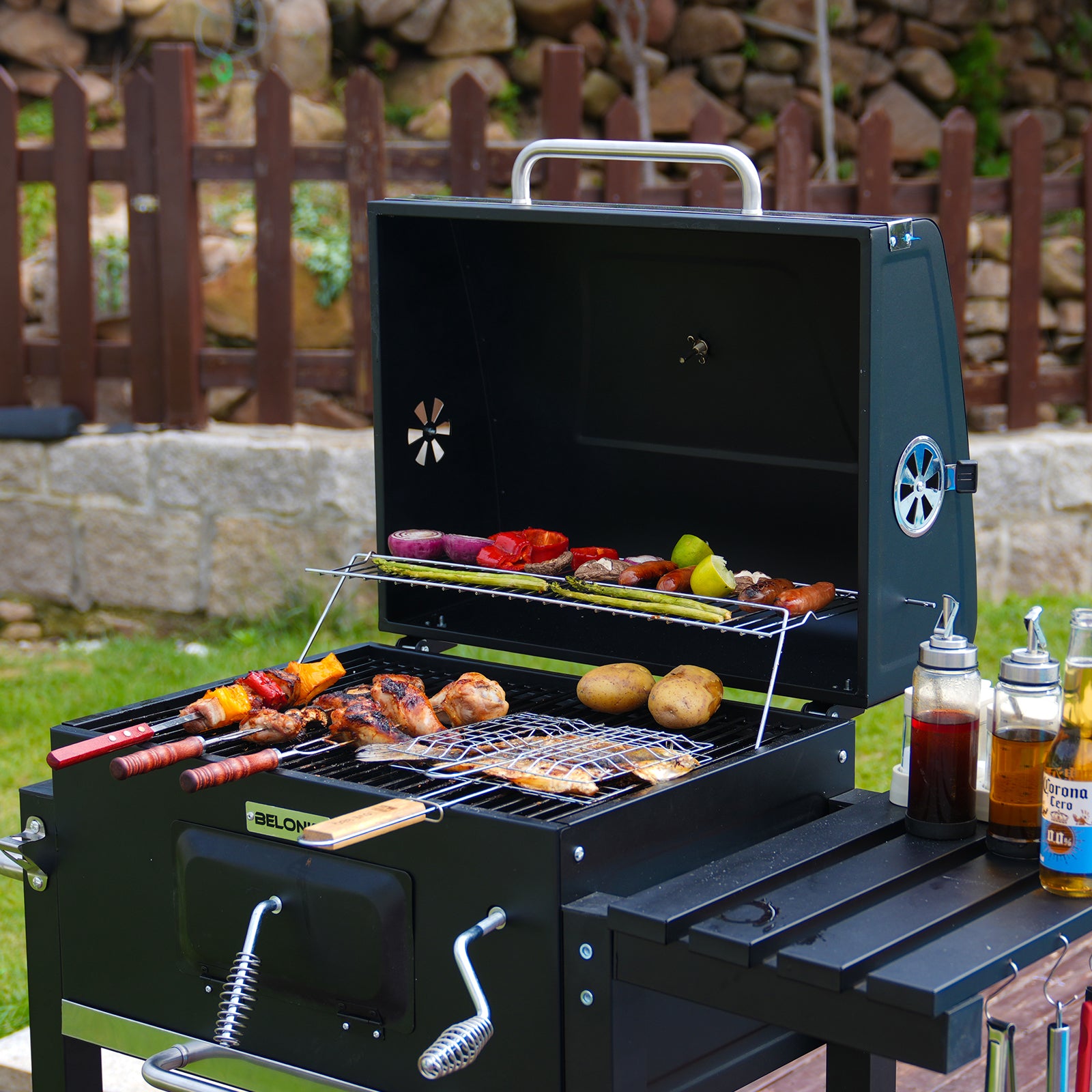 HOMAVO Charcoal Grill, Grill Surface: 56 × 42.5 cm, Height Adjustable Carbon Tub, Foldable Side Table
