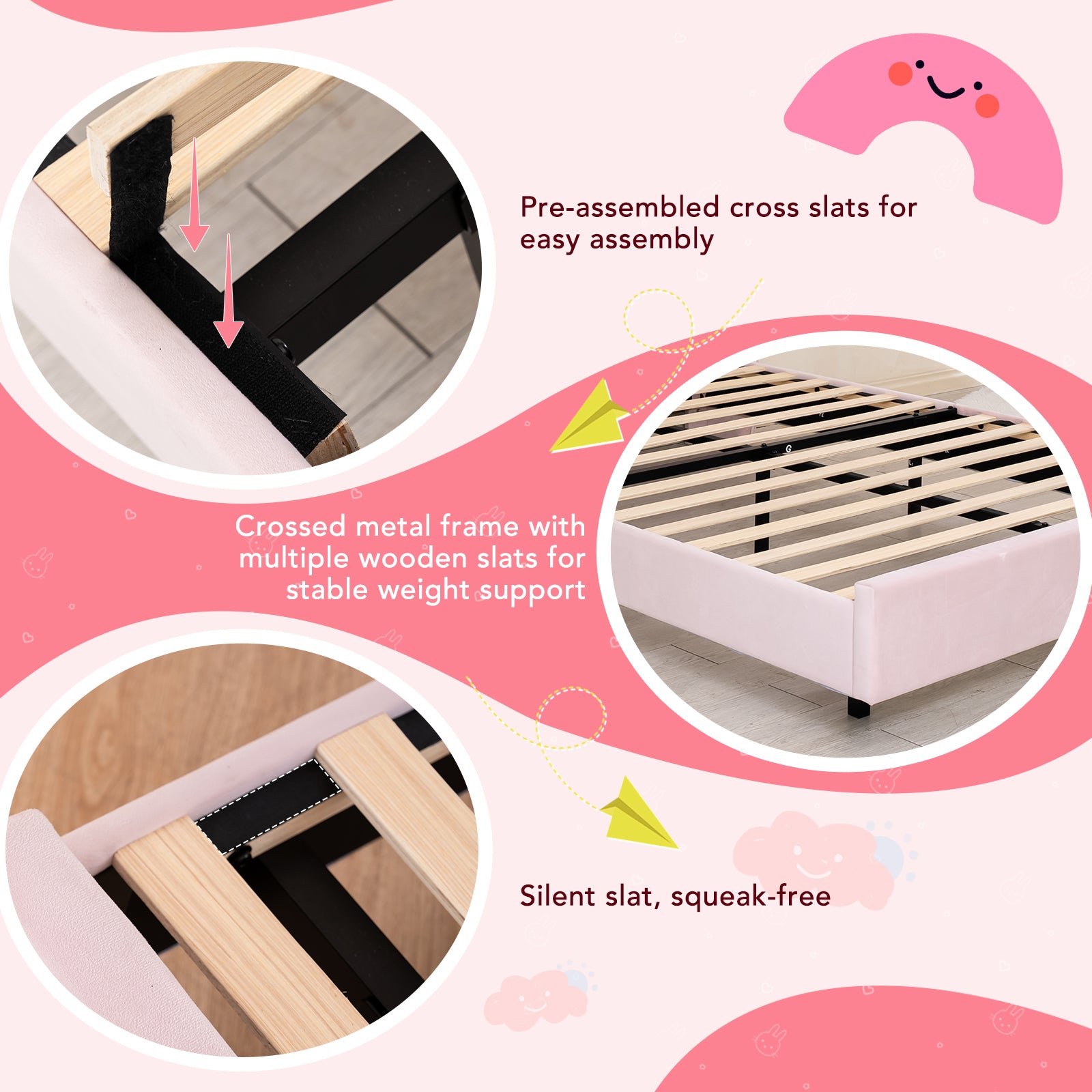 The bed frame is made of strong steel and high-quality wooden slats, stable and durable. Load capacity up to 350 kg; the bed remains stable even during play or jumping. Strong support ensures long-lasting stability and safety.