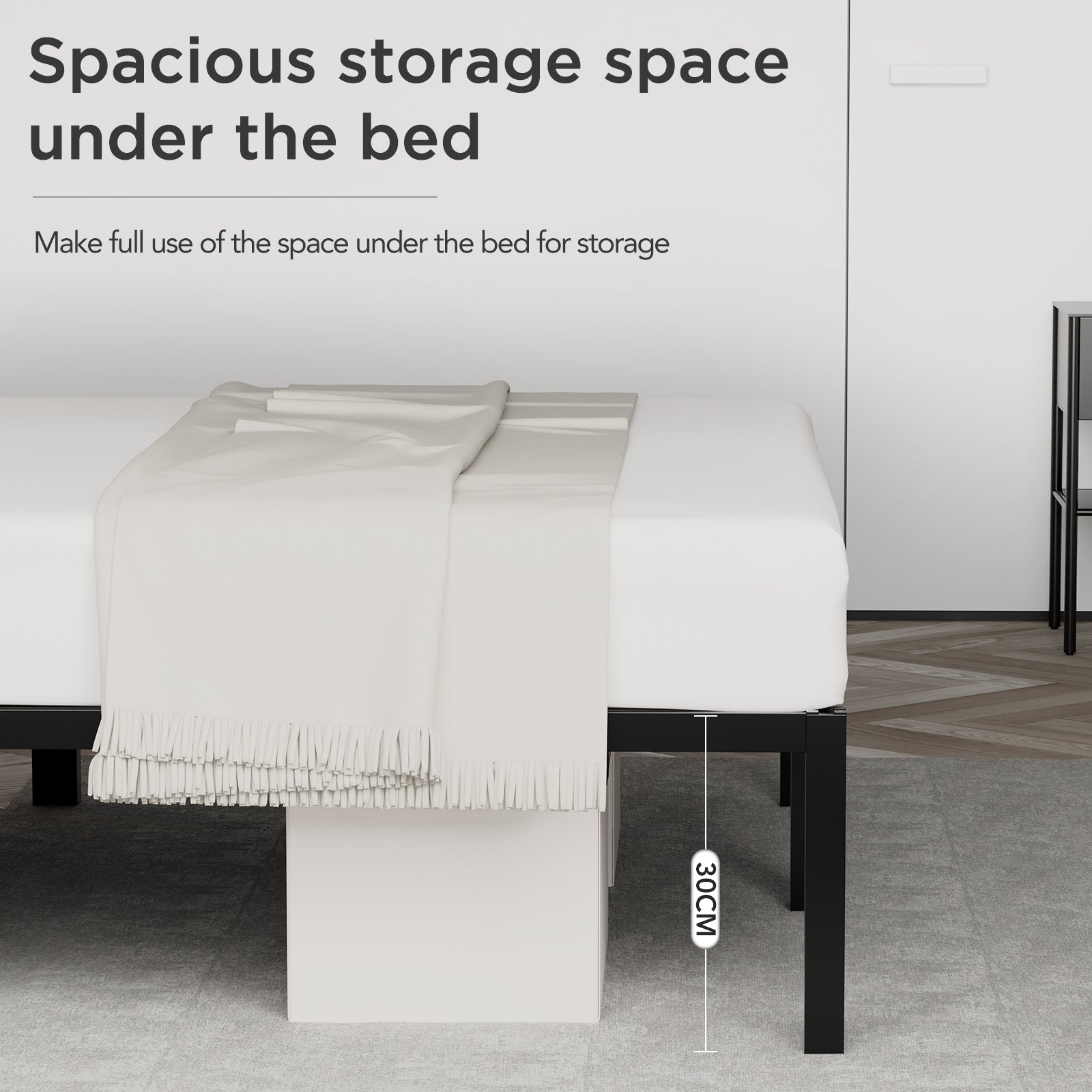 With a clearance of about 30 cm, you can easily store suitcases, boxes, or seasonal clothing under the bed. This helps keep your bedroom tidy and organized — perfect for small homes.