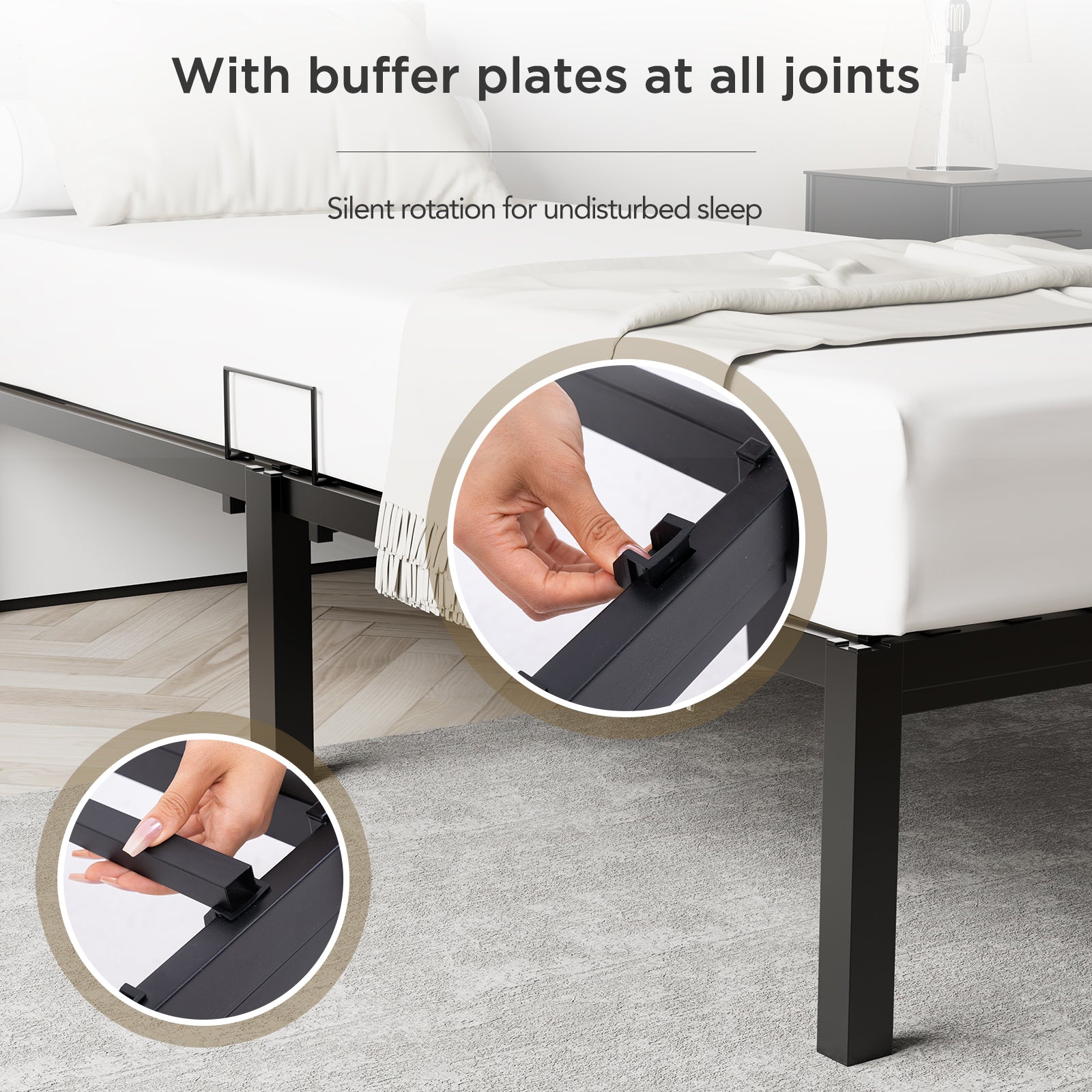 Bed legs are equipped with anti-slip pads and shock-absorbing plastic clips, reducing friction and noise. The frame stays securely in place while protecting your floor, ensuring a quiet and safe sleeping environment.