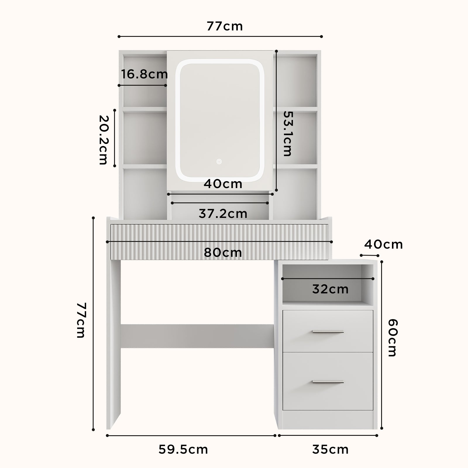 Keep your beauty essentials neatly organized with the top shelf, 7 open compartments, 1 large drawer, and an extra-large LED mirror cabinet featuring 2 drawers and open shelves.