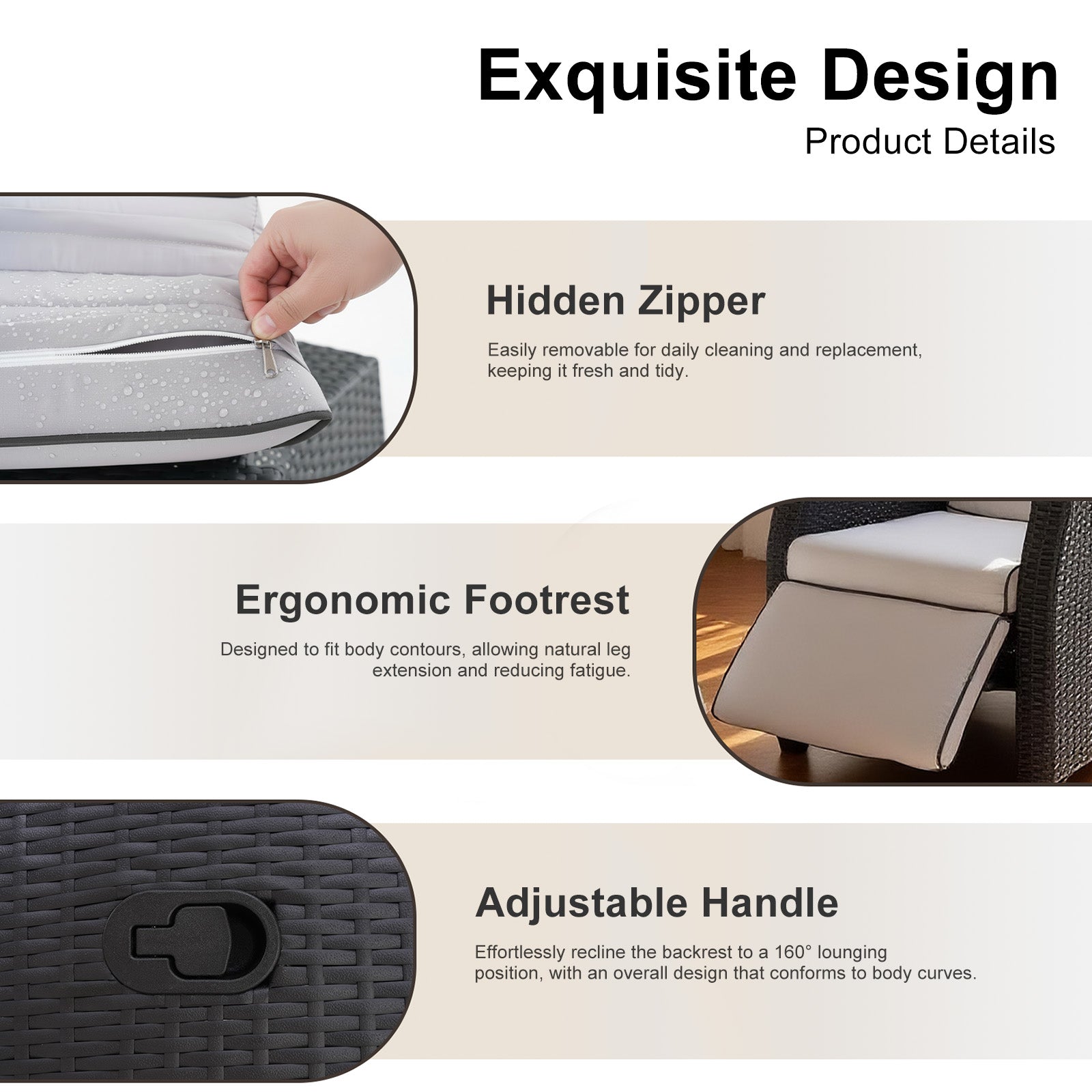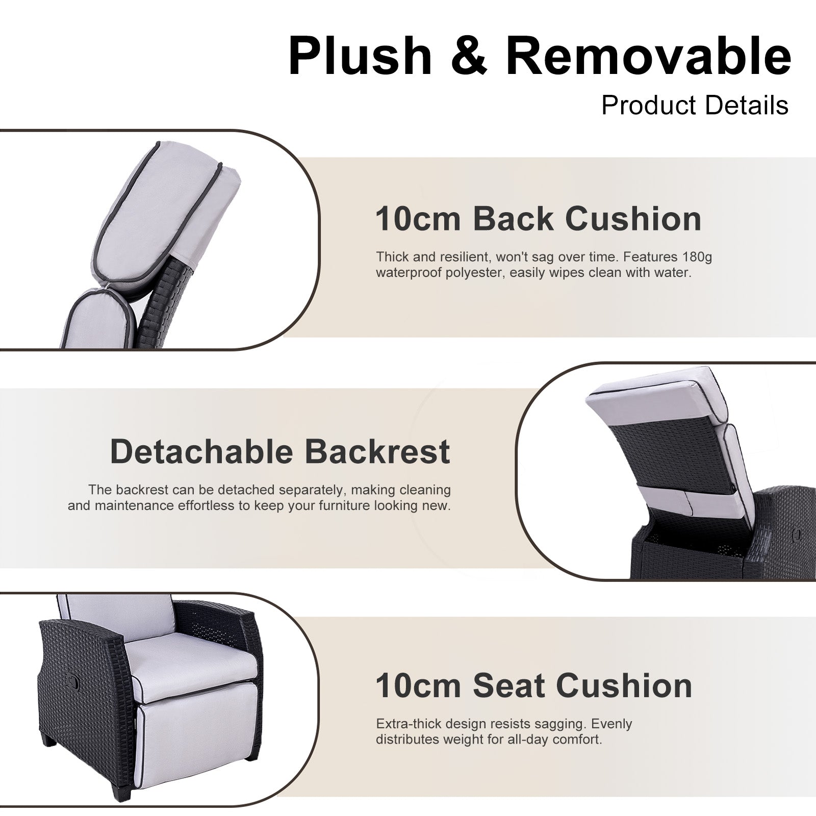 The recliner includes cushions filled with high-density PP cotton for a comfortable sitting experience. The rattan surface is easy to maintain — simply wipe with a soft cloth and a bit of water or mild detergent. Stain removal is easy and gentle on the material, making daily cleaning and care hassle-free.