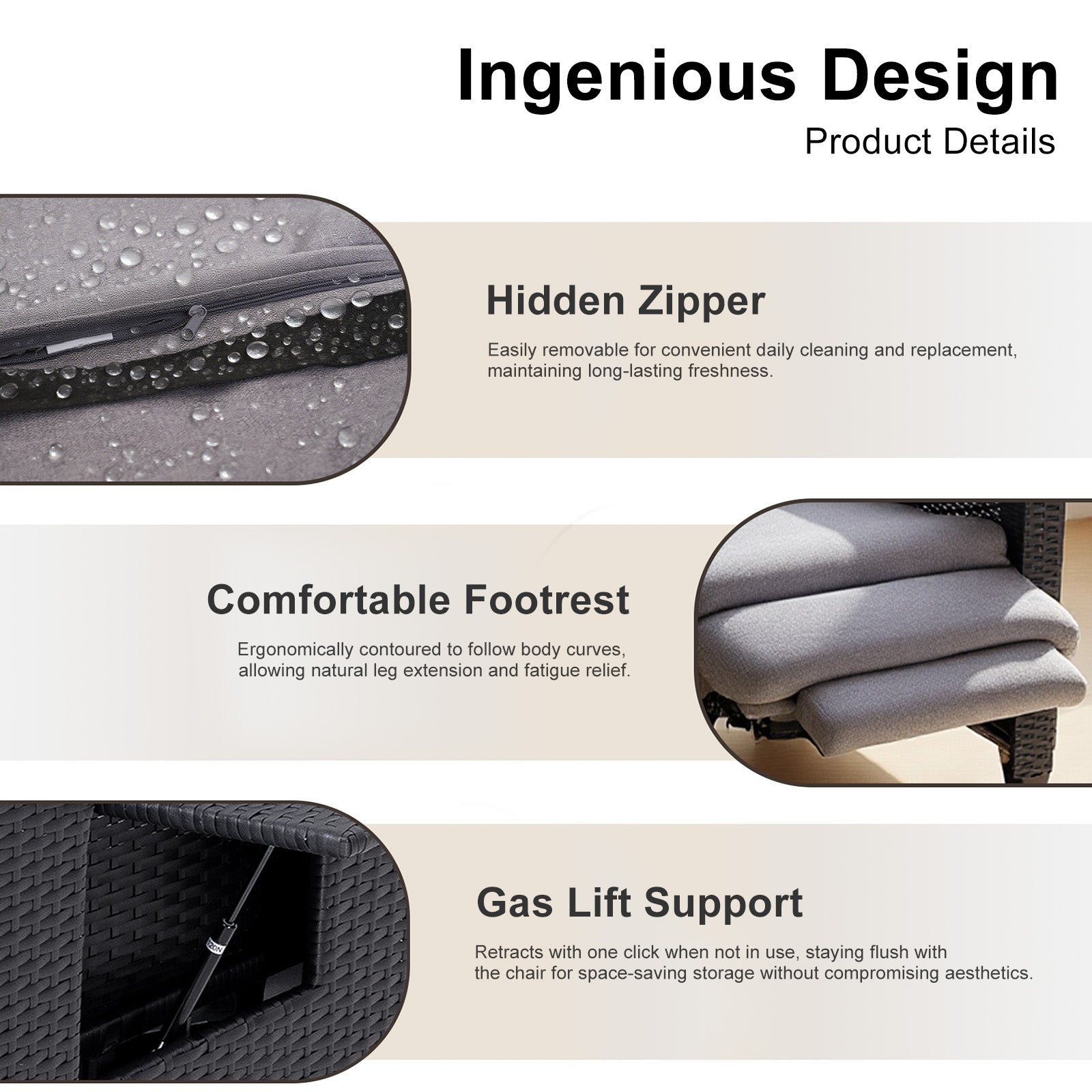 160°, when paired with the extended footrest, allows full-body relaxation and helps relieve fatigue. Thoughtfully designed for both support and comfort, suitable for indoor and outdoor use.